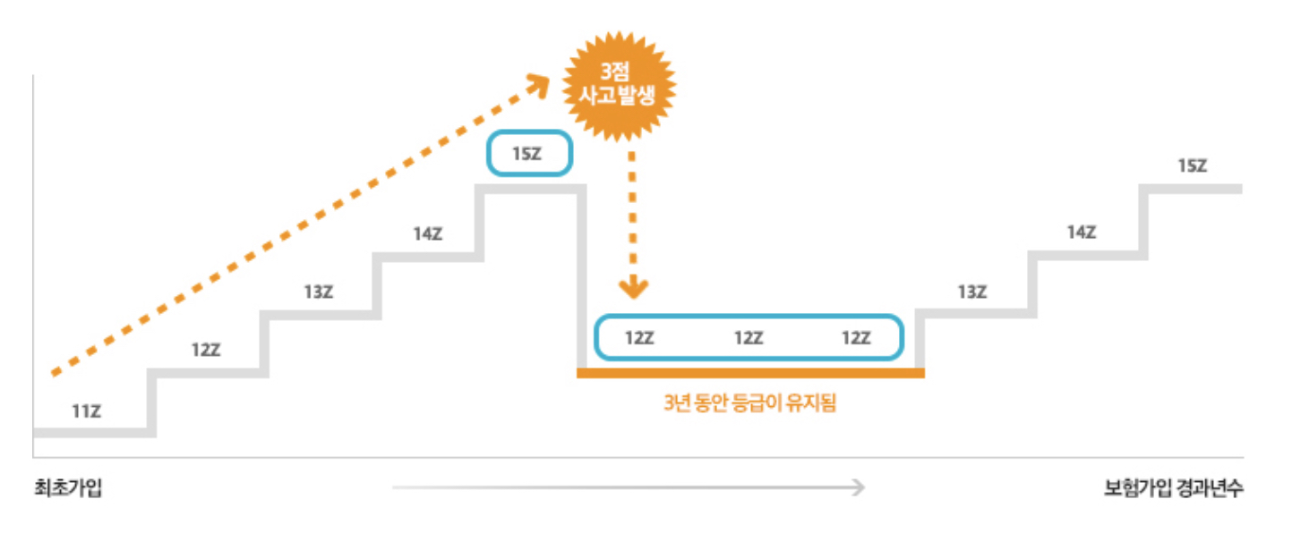 할인할증등급은 최고가입시 11Z로 시작하며 29P까지 등급이 나뉘어져 있으며 무사고로 갱신하는 경우 1등급씩 할인 적용되고 장기무사고등급인 29P까지 가능합니다. 사고가 발생할 경우 보험회사별로 자동차보험료의 차이가 많이 나게 되는데 이는 보험회사별 할인 할증 적용율이 달라서 그렇습니다. 자동차보험료는 갱신시 사고유무에 따라 보험료에 영향을 많이 미치게 되는데 특히 유의할 부분은 사고건수요율입니다. 경미한 사고로 인해 물적할증기준 이하의 금액으로 사고처리를 할 경우 할증에는 영향을 미치지 않는 점수라고 하더라도 최근 3년이내 사고건수가 합산되어 보험료가 할증될 수 있습니다