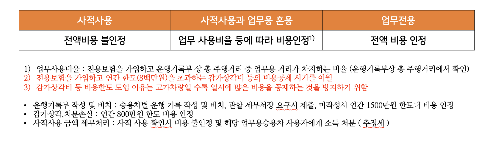 업무전용승용차보험(임직원한정특약) 미가입을 포함하여 업무용자동차를 사적으로 사용한 경우 확인된 금액은 손금부인되며 그 사용자에게 소득처분되므로 법인세뿐만 아니라 소득세도 추가 부담하여야 합니다. 개입사업자의 경우 필요경비로 인정되지 않으므로 소득세를 부담하여야 합니다. 최근 사적사용이 확인된 개인사업자분들이 비용처리를 한 사적사용부분이 비용불인정되면서 소득으로 귀속되어 추징세를 내시는 경우가 대부분 이런 경우입니다. 또한 많이 하는 질문 중에 최근 자동차보험을 새로 가입하거나 임직원한정특약으로 배서처리를 하려는 경우 개인사업자의 차량이 한대일 경우에 대한 질문과 자동차보험 설계시 2대이상이어야 혜택의 대상이 됩니다라는 보험사의 안내문구는 비용특례 대상이 되는 개인사업자의 차량이 한대인 경우는 의무가입대상자가 아니며 비용 또한 인정됩니다. 2대이상이어야 혜택이 된다는 문구는 차량이 두대이상일 경우 1대를 제외한 나머지는 의무가입대상차량이며 가입을 해야만 혜택이 적용된다는 뜻입니다