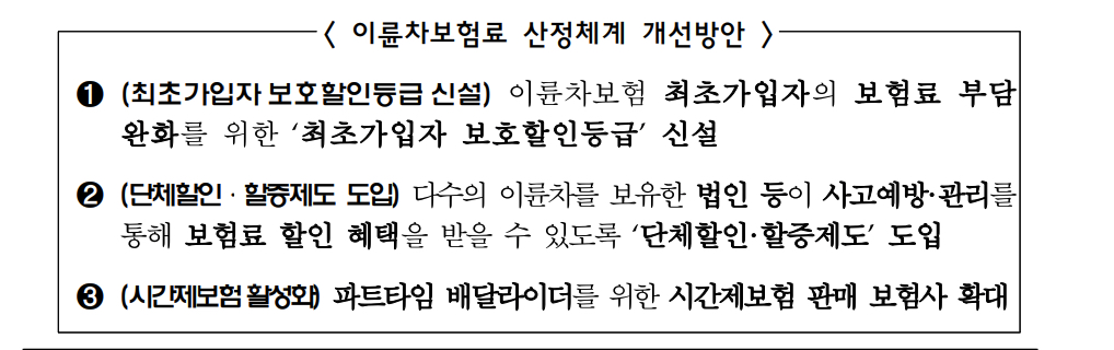 금융감독원은 앞서 말한 이륜차보험의 비싼 보험료 부담을 해소를 통해 책임보험 가입을 활성화하기 위해 무보험 오토바이가 많아진 가장 큰 이유인 보험료 부담을 줄여 가입을 제고하기 위한 「 이륜차 보험료 산정체계 」 개선방안을 발표하였습니다. ① 최초가입자 보호할인등급신설 ② 단체할인·할증제도 도입 ③ 시간제 보험 활성화 가 주요내용입니다.