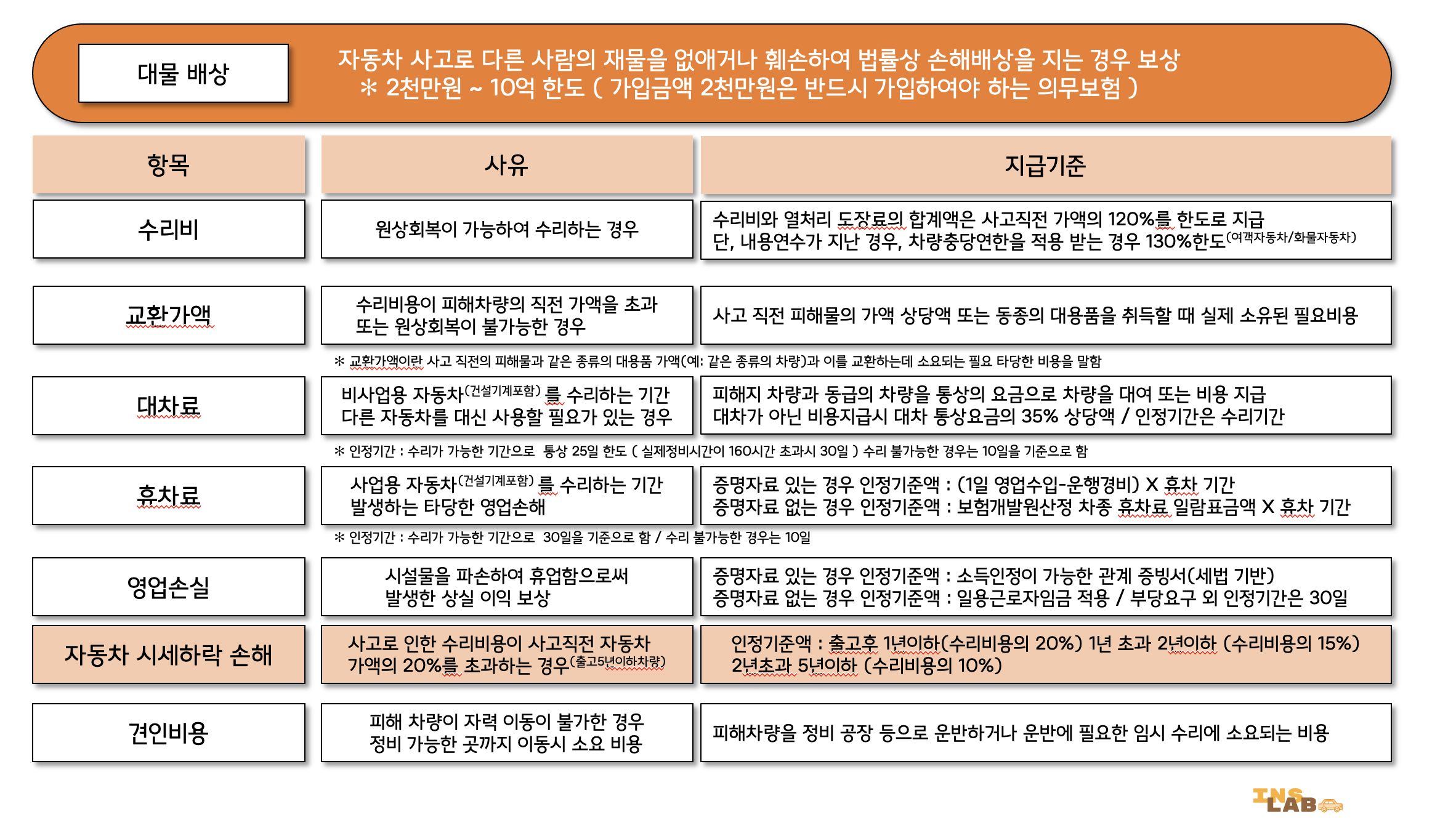 대물배상은 크게 수리비, 교환가액, 대차료, 휴차료, 휴업손해, 영업손실, 자동차시세하락손해, 견인비용으로 구성되어 있으며 이는 비사업용자동차와 사업용자동차로 구분해서 적용됩니다. 대물배상은 사고발생의 경우의 수가 워낙 많이 존재하다보니 손해액이 A이면 B이다라는 공식이 적용되지 않습니다. 사고발생시 해당 보험회사 보상담당과 차량손해사정사의 도움을 받으시는게 우선이고 가입하시는 경우 대물배상의 기본적인 내용만 숙지해놓으시면 좋습니다. 우선 가장 많이 접하는 수리비용은 피해차량이 원상회복이 가능하여 수리를 하게 되는 경우 지급되는 보험금이며 수리비와 열처리비용이 해당됩니다. 수리비용의 한도는 120%가 기준이며 여객자동차운수사업법 제 84조 제 2항 또는 화물자동차운수사업법 제 57조 제1항에 의한 차량충당연한에 해당되는 승용자동차나 화물자동차의 경우는 130%를 적용합니다.