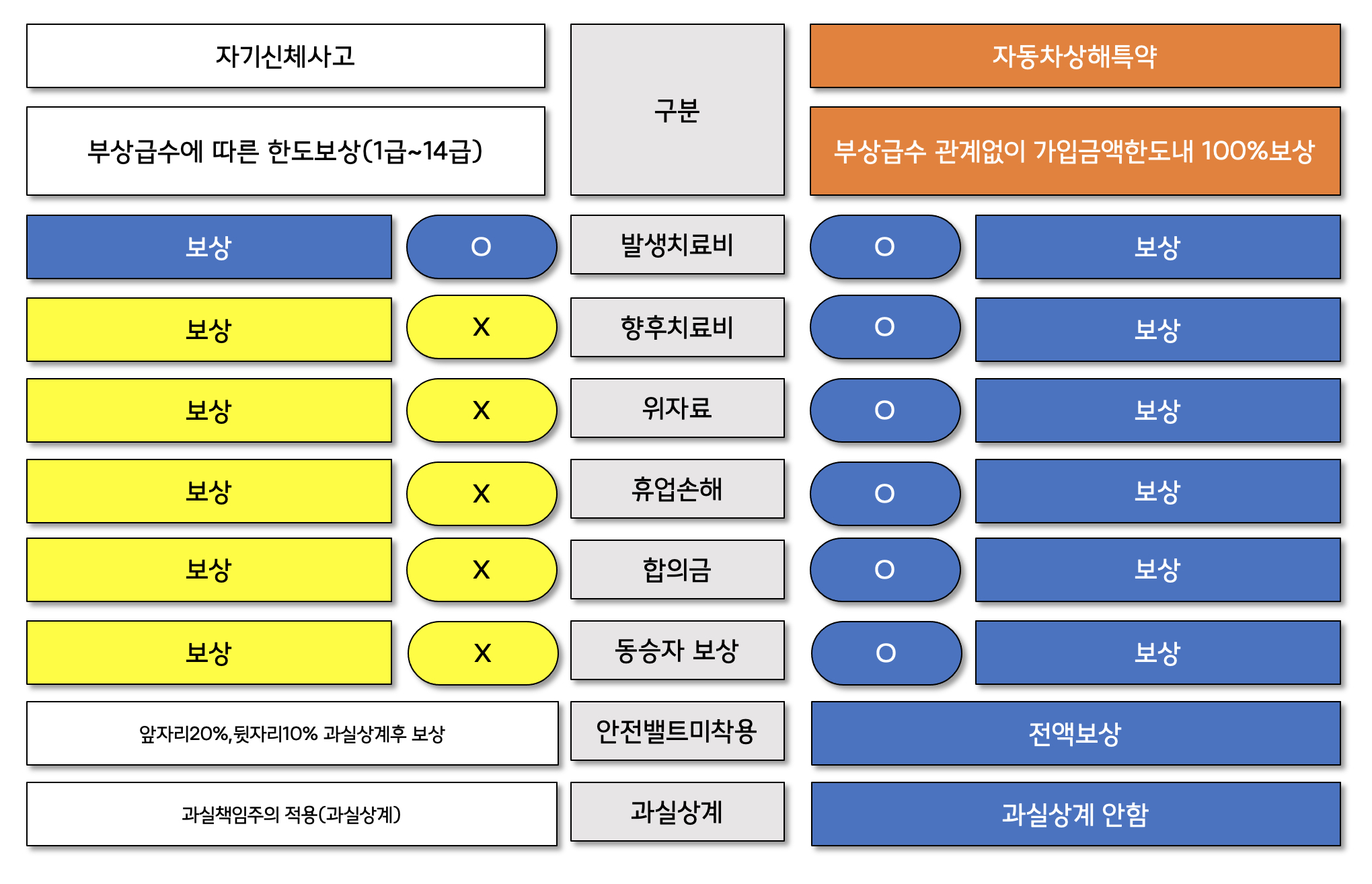 이중 자동차상해특약은 자기신체사고담보와 동일한 구조로 되어 있습니다. 자동차보험에서 자기신체사고 담보와 자동차상해 특약을 동시에 가입할 수는 없고 이 중 한가지를 선택하게 되는데 단지 보험료만을 생각해서 싸게 가입하고자 한다면 자기신체사고담보를 보험료만이 아닌 충분한 보상을 고려해서 선택한다면 자동차상해특약을 가입하게 됩니다. 자기신체사고 담보와 자동차상해특약은 비슷해보이지만 자동차사고가 발행했을 때 정말 하늘과 땅의 차이를 보여주게 됩니다